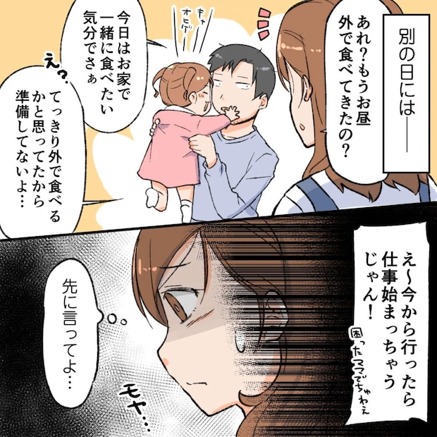 そのときの気分で「外に食べに行く」「家で食べる」と自由気ままに決めている主人公ですが、ごはんの準備をする妻からしたら大迷惑ですよね。「仕事だから仕方ない」と我慢する妻の気持ちに少しでも気が付いてくれると良いのですが・・。