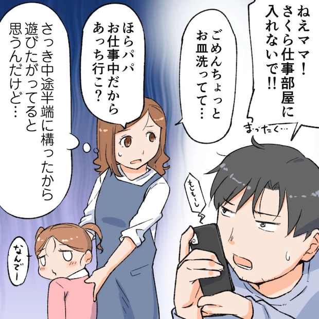 さくらはまだ小さいのでオレが仕事中だと分からず来てしまうのは仕方ありません。でも、だからこそ妻にはちゃんとさくらを見ていてもらわないと困ります。オレはスマホの通話口を押さえながらすぐに「ねぇママ!さくら仕事部屋に入れないで!!」と妻を呼びました。慌ててやってきた妻は「ごめん、ちょっとお皿洗ってて・・。ほら、パパお仕事中だからあっち行こ?」とさくらを別の部屋に連れて行ってくれました。家にはいるものの、オレは仕事中。そのへんは妻にもう少し気を遣ってもらいたいなと思います。