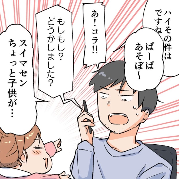 その後、気を取り直して取引先と電話で話していると、突然「ぱーぱ、あそぼ~」とさくらが仕事部屋に入ってきてしまいました。「あ!コラ!!」と小声で注意していると「もしもし?どうかしました?」と聞かれ、オレは「スイマセン。ちょっと子どもが・・」と慌てて謝罪。