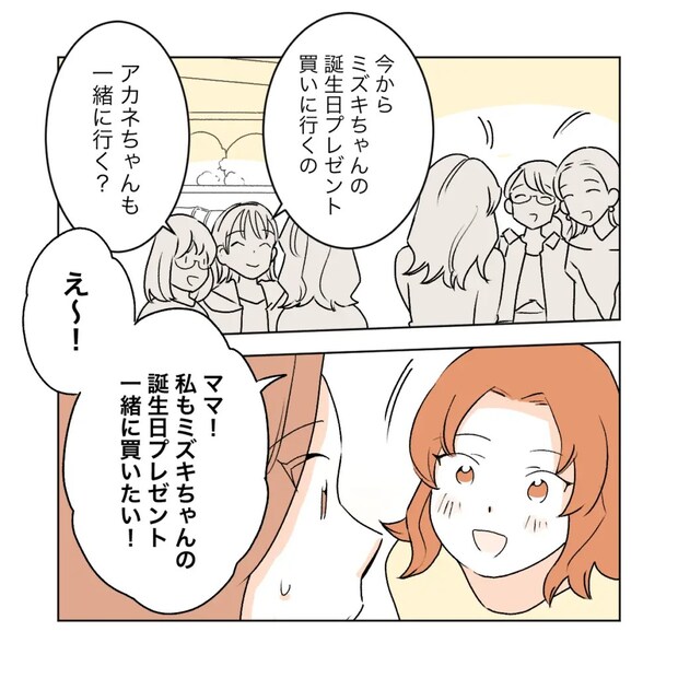 ミズキの誕生日プレゼントを買いに来たと言う2人に誘われて、アカネはもちろん参加したがりました。キラキラした目で「私もミズキちゃんの誕生日プレゼント一緒に買いたい!」と言われて、ダメとは言えず口ごもるカエデ。