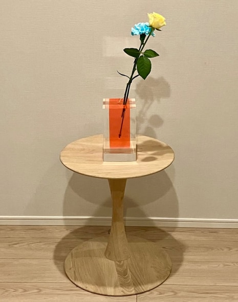 完全受注販売というハードルの高さと価格の高さにたじろいだが、その後数ヶ月、蛍光ピンクと透明のアクリルが生み出す非現実感が解けない謎のように頭に残った。迷った挙句、京都の巡回展で購入することに。といってもその時はちょうど飛騨高山へフィールドワークに行っていたので、知人に頼んで購入してもらったことを覚えている。知人曰く、美術館の物販で購入する人が滅多にいないとのことだったが……。やはり私と同じように皆たじろいだのだろうか。