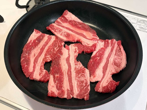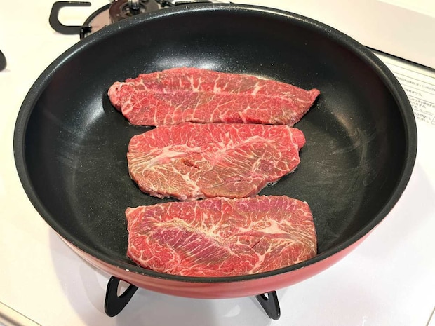 1枚あたりのサイズは約15cm。我が家にあった大きめのフライパンに並べてみましたが、お肉は3枚しか入りませんでした。