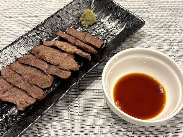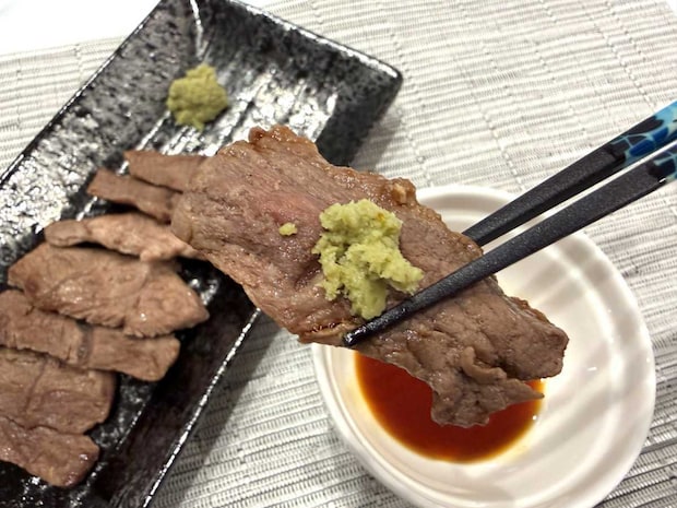 さらに、お肉をわさび醤油につけて食べてみました。わさびのツンと来る辛味が加わって、赤身肉の旨味がより一層引き立ちます!