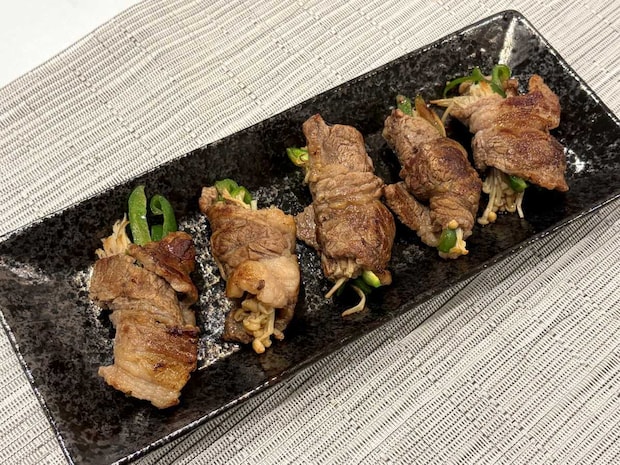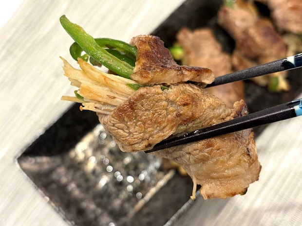 個人的には少々こってり感が強い印象を受けたので、アレンジとしてピーマンとえのきをカルビで巻いてみました。BBQの定番野菜で、簡単にできるアレンジですよ!