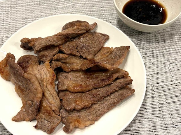 焼き上がったミスジ焼肉を実食していきます。筆者はシンプルに塩コショウで味付けしてみました。