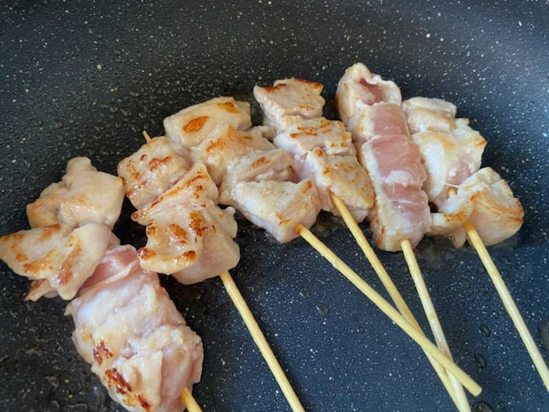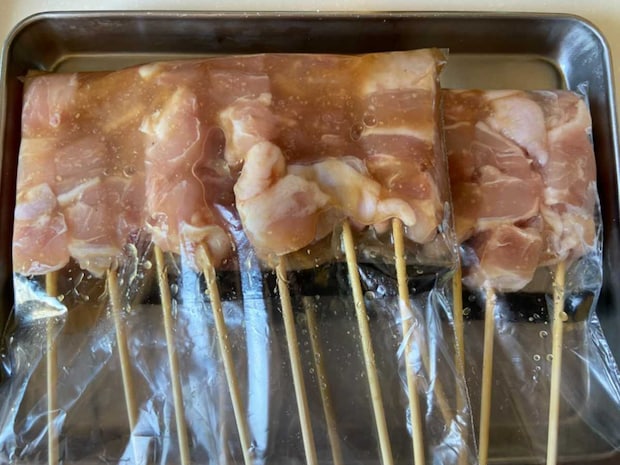 今回はごま油、塩コショウ、にんにくを揉みこんだ塩ダレのもも串を作ってみました。