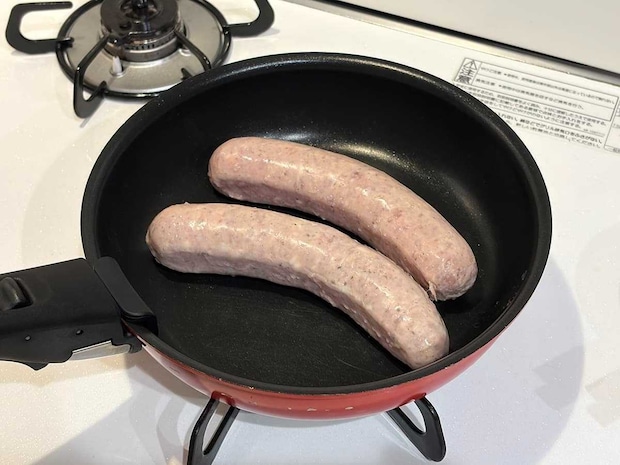 焼き上がったソーセージがこちら。しっかり焼き目が付くと見た目が良くなるだけでなく、ベーコンの香ばしい香りも漂ってきて美味しそうです!