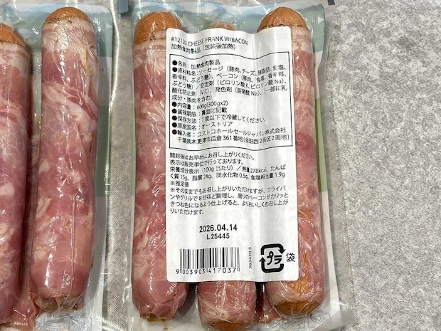 チーズが練り込まれたソーセージに、ベーコンをくるりと巻いた一品。300g×2パックの計600g入りで、価格は1,298円(税込)です。
