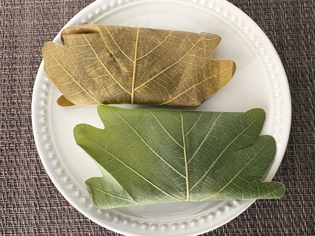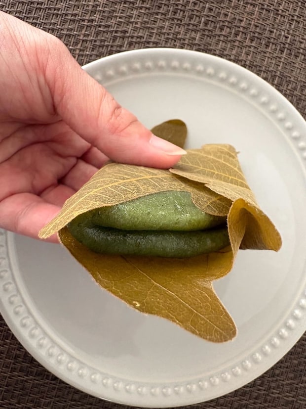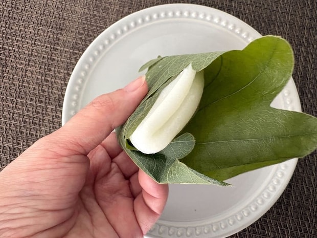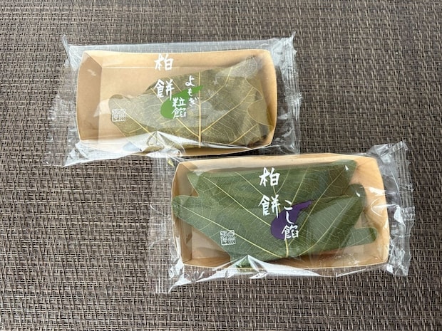 柏の葉に包まれており、和の風情が感じられます。袋から取り出すと柏葉の香りがふわっと広がり、春の訪れを感じさせてくれます。こし餡は緑色の柏葉に、よもぎ粒餡は茶色の柏葉に包まれています。