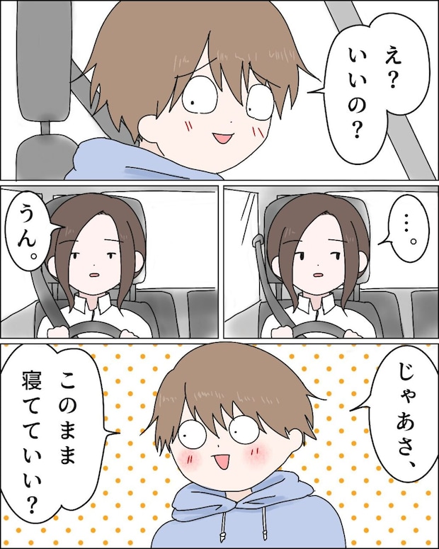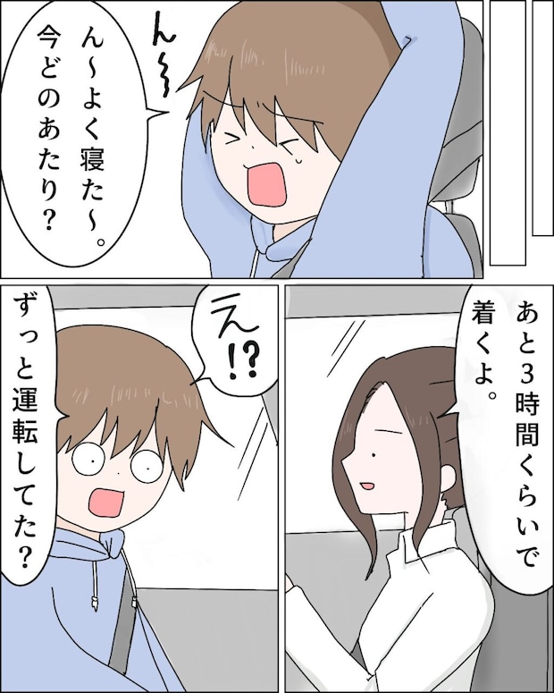 数時間後、ようやくレイは目を覚ましました。「ん~よく寝た~今どのあたり?」と伸びをするレイに、私は淡々とした表情で「あと3時間くらいで着くよ」と答えます。するとレイは、「え!?ずっと運転してた?」と驚いたように言いました。