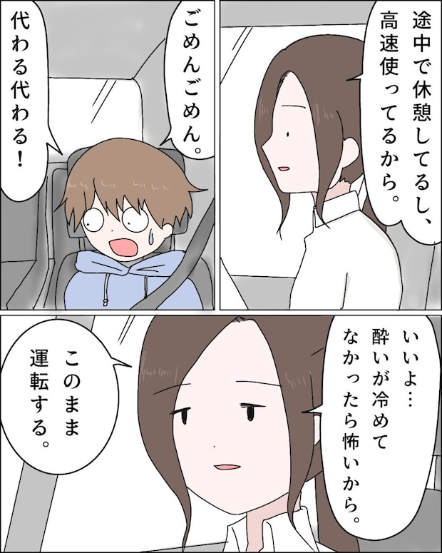 私は表情を変えずに、「途中で休憩してるし、高速使ってるから」と答えると、レイは「ごめんごめん!代わる代わる!」と慌てたように言いました。私はそんな彼の申し出を、「いいよ・・・酔いがさめてなかったら怖いから、このまま運転する」と静かに断りました。