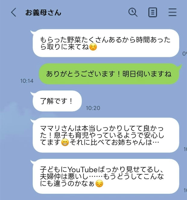 良好な関係を築いていたとしても、互いに「理解できない」と思うところは、だれしもあるのではないでしょうか。義母のことはキライではないものの、LINEのやり取りの最後に、必ず義姉夫婦のグチを聞かされるという投稿者さん。2回しか義姉に会ったことがなく、共感することもできないため、グチはスルーしているといいます。何を求められているのか…どうするのが正解なのかわからず、困っているそうです…。義母との人間関係についての悩みを紹介します。