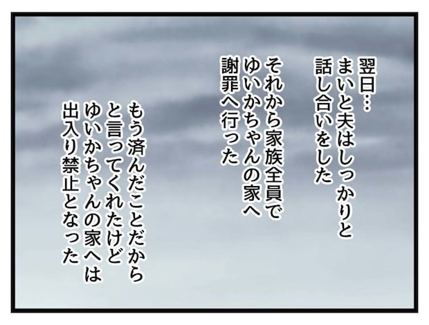 夫に自分を見つめ直すよう言われ、心から反省するたまみ。まいは夫と話し合いをし、家族でゆいかの家に謝罪に行きました。出入り禁止になったことはやってしまったことを考えると当然ですが、きちんとけじめをつけたことでたまみたち家族としても新しいスタートを切れそうです。