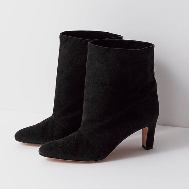太めの筒と細めのヒールのバランスが絶妙でチャーミング。スカートスタイルと相性がよく、バランスが取りやすいんです。足首が締まっていないので、脚のむくみやすい方も気にならないはず。ブーツ[ヒール6.5㎝]¥89,100(ネブローニ)