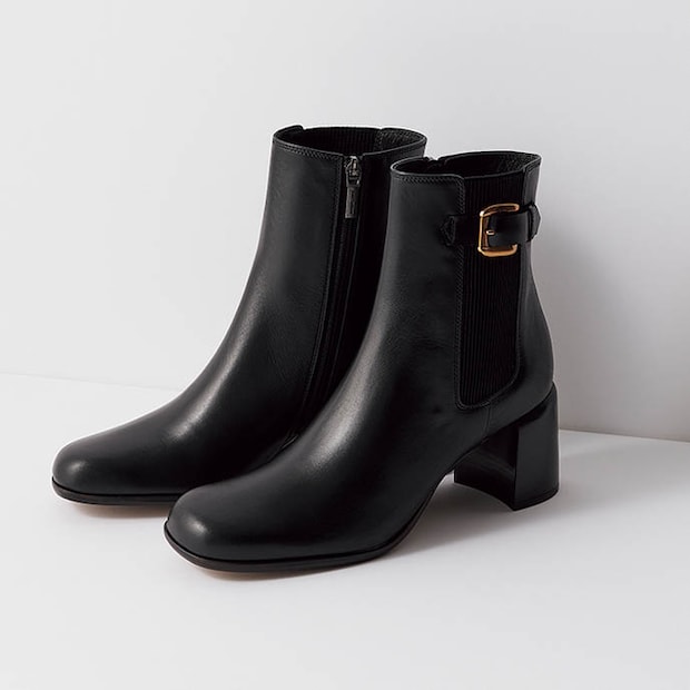 超ベーシックデザインをお探しの方にオススメ。パンツにもスカートにもOKでオンオフを問わない万能ブーツ。しかも全体的に細身のシルエットでキレイ見えしますよ。ブーツ[ヒール6.5㎝]¥40,920(J&M デヴィッドソン/モーダ・クレア)