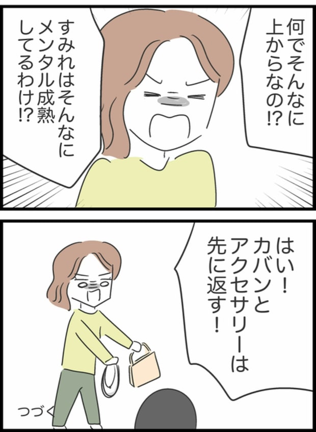 すみれの指摘があまりにも的確で何も言い返せず「もう帰って!」「どうしてそんなに上からなの?」と、りかは文句を言いすみれが貸していたカバンとアクセサリーを「先に返す!」と怒りながら渡してきたのでした。