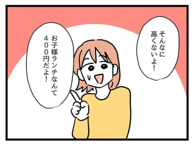 カフェに誘ったときと同じで「もったいない」と渋るりさ。はるかは「お子様ランチは400円だよ」と説得します。