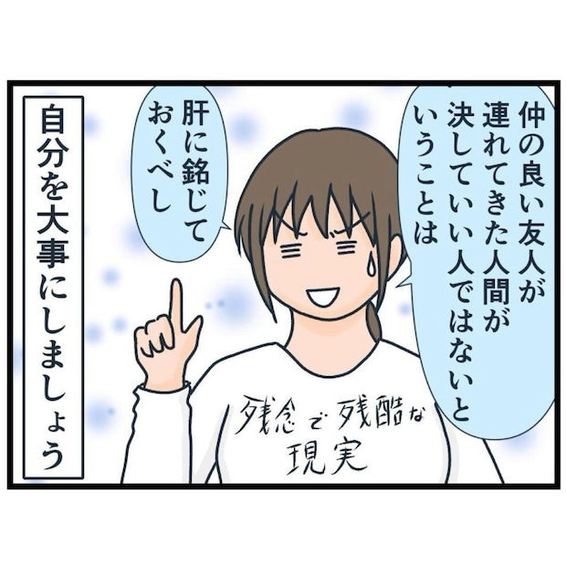 今回「仲のいい友人が連れてきた人物が必ずしもいい人とは限らない」と思い知ったナエくまさん。仲がいい相手の友人というだけで信じるのではなく、何事も冷静に判断しなくてはと思わせられる作品です。