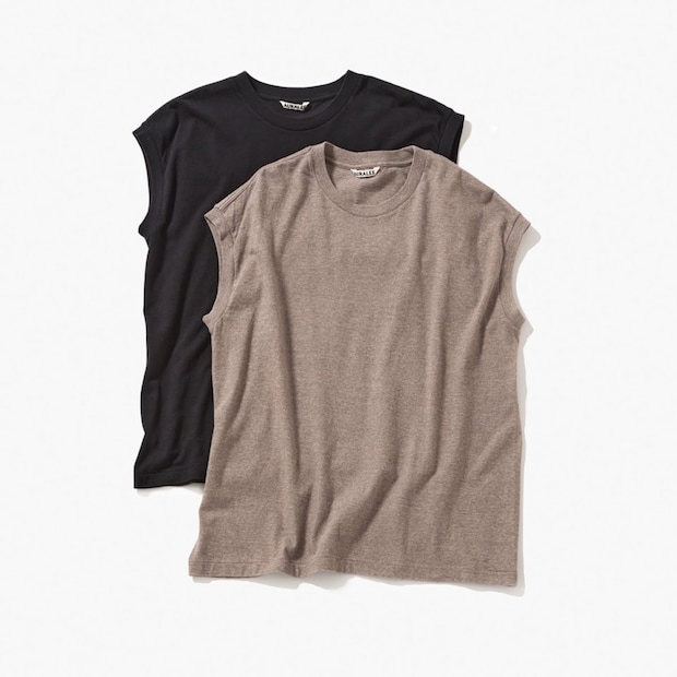 オーラリーのスリーブレストップスは極上の肌触りがたまらない丸胴天竺素材を使用。いいカットソーを知ると、結局そればっかり着ちゃいますよねえ。各9,900円。