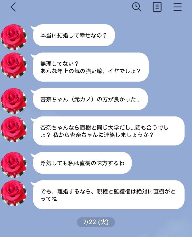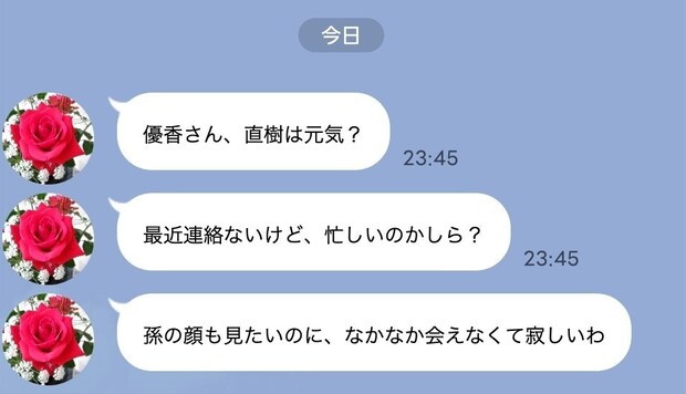 義母からのメッセージをさかのぼって見たところ、衝撃的な内容がつづられていました…。安易に離婚をうながし、家庭を壊すような発言をするなんて、信じられません。わが子や孫の幸せより、自分のさみしさを埋めることしか考えていないようです。