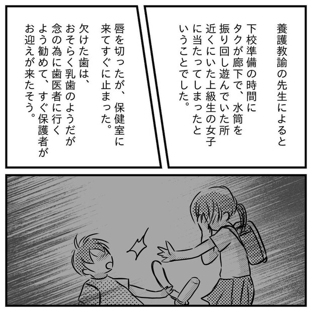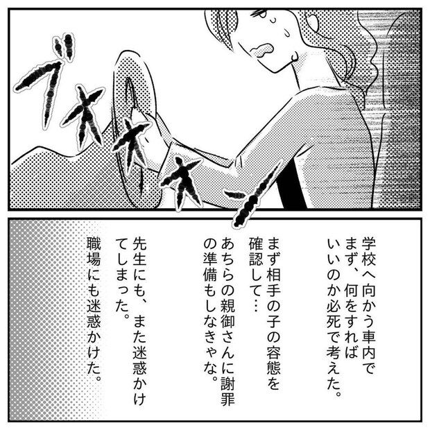 小学校で友だちに水筒をぶつけ、ケガをさせてしまった息子。もっつんさんが迎えに行くと...。
