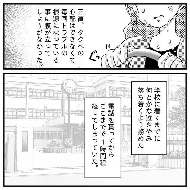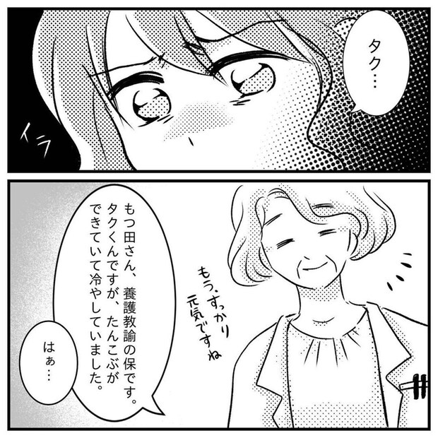 そんな母の気持ちも知らず、タクくんは保健室で笑顔で待っていました。もっつんさんはその事にもモヤモヤ、イライラした気持ちを抱えたようです。
