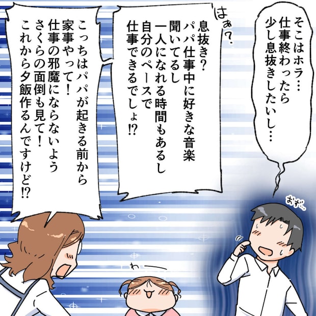 勢いに押されながら「そこはホラ・・・仕事終わったら少し息抜きしたいし・・・」としどろもどろに言えば、「息抜き?パパ仕事中に好きな音楽聞いてるし、一人になれる時間もあるし自分のペースで仕事できるでしょ!?こっちはパパが起きる前から家事やって!仕事の邪魔にもならないようさくらの面倒も見て!これから夕飯作るんですけど!?」と痛烈なカウンターが。