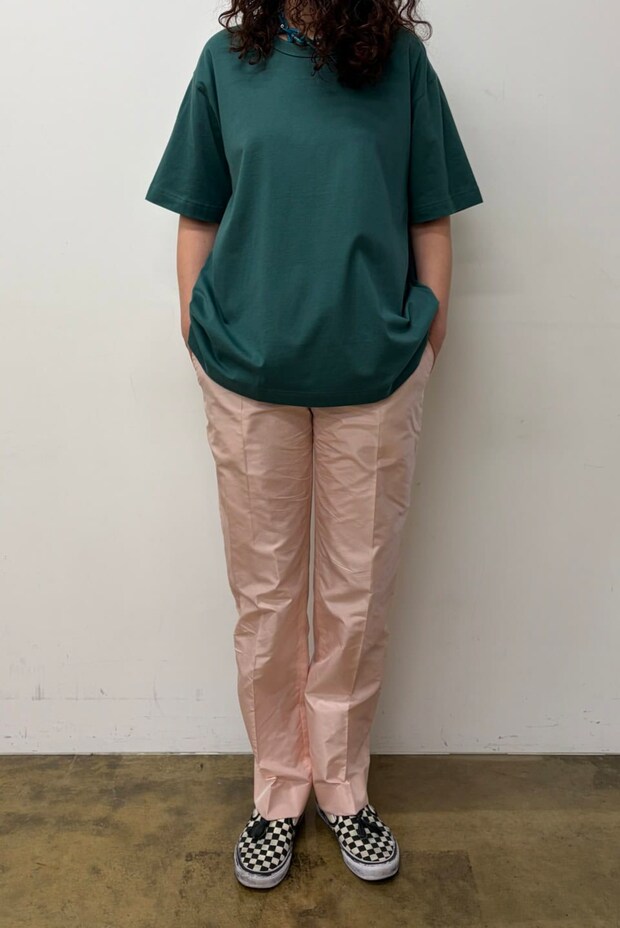 長年愛用したかのようなフェード感のあるグリーンの発色が洒落ているアウターTシャツは、M・L・XLの3サイズ展開(しろ・くろは、XS※ファミマオンライン限定・S・M・L・XL・XXLの6サイズ展開)。筆者はたっぷり着たかったのでXLをチョイスしましたが、しっかりとしていながら落ち感も美しい生地なので、着ぶくれすることなくスッキリと着こなすことができました。