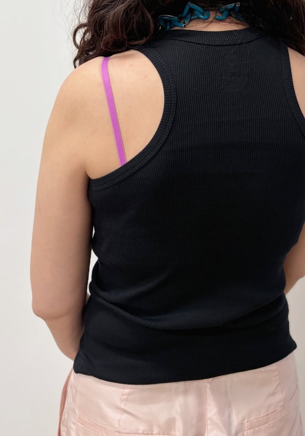 1枚でもインナーでも活躍するリブタンクトップはUSAコットン製。ネックはやや深めに設定されていますが、これはブラウェアのチラ見せも計算されているそう。確かに合わせて見るとブラウェアのチラ見え具合が絶妙。同時にネックがつまったものよりすっきり着こなせるのもうれしいポイントです。