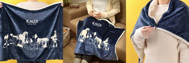 ネイビーを基調に、さまざまな種類の犬と「KALDI」ロゴをデザインしたブランケット。大きさは、約縦60cm×横90cm。