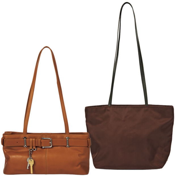 左:「カギ付きもポイント♡」ブラウンバッグ[H17.5×W35.5×D8.3㎝]¥72,600(オソイ/ユナイテッドアローズ 渋谷スクランブルスクエア店)、右:ナイロンバーガンディバッグ¥40,700[H17×W23.5×D8.5㎝](ヴァレスク/スーパー エー マーケット 青山)