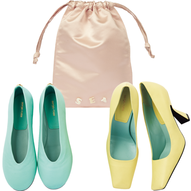 ピンクサテン巾着[H27×W21㎝]¥13,200(シー/エスストア)、イエローパンプス[ヒール6㎝]¥135,300、ライトブルーバレエシューズ[ヒール0.5㎝]¥115,500(共にセルジオ ロッシ/セルジオ ロッシ ジャパン カスタマーサービス)