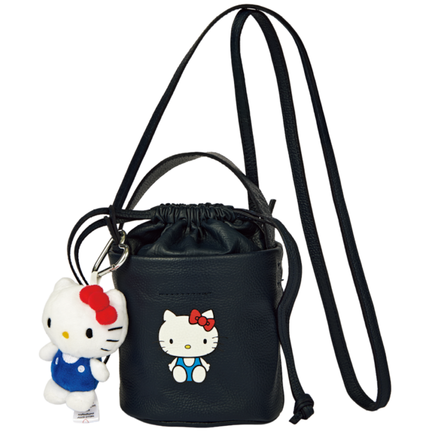 ネイビーハローキティバッグ[H13×∅13㎝]¥55,000、バッグに付けたハローキティチャーム¥4,400(共にザハイライツ)