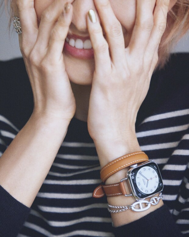 時計※Apple Watch本体とベルト〈アトラージュ〉¥162,400、ブレスレット〈ニュー・ファランドール〉[SV]¥177,100、リング〈シェーヌ・ダンクル・アンシェネ〉[SV]¥88,000(全てエルメス/エルメスジャポン)、ボーダーニット¥34,100(ウィッティ ヴィンテージ)