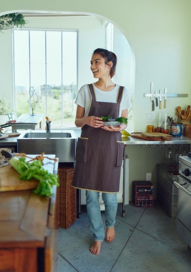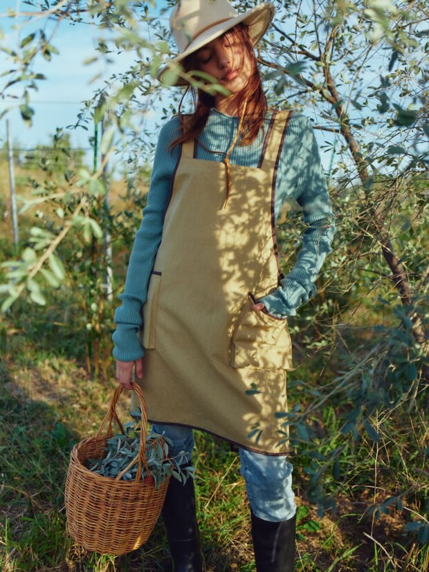 オーガニックコットンとリネンのキャンバス地で仕立てたエプロンは、染料までオーガニックというこだわりよう。ブラウンはエスプレッソの豆から、ベージュはエキナセアというハーブから染められたもの。紐やボタンをなくしたことで、パッと被るだけで簡単に着用できます。クッキングや掃除、DIY、土いじりなどにも重宝しそう。ビッグサイズのポケットはマチ付き。