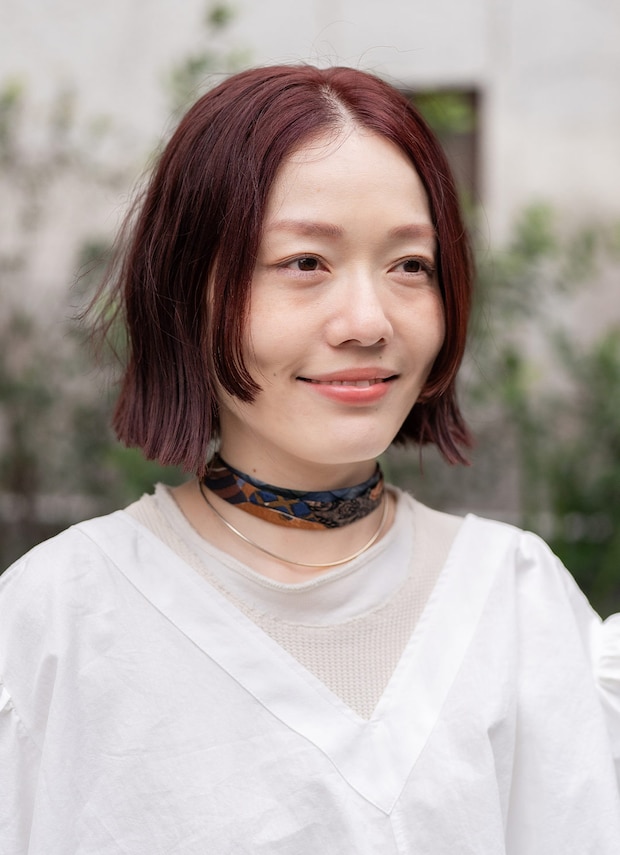 『マリオン ヴィンテージ』のタイをひと巻き。ゴールドネックレスとの重ねづかいで顔まわりに華やぎをプラスしたのがポイント。