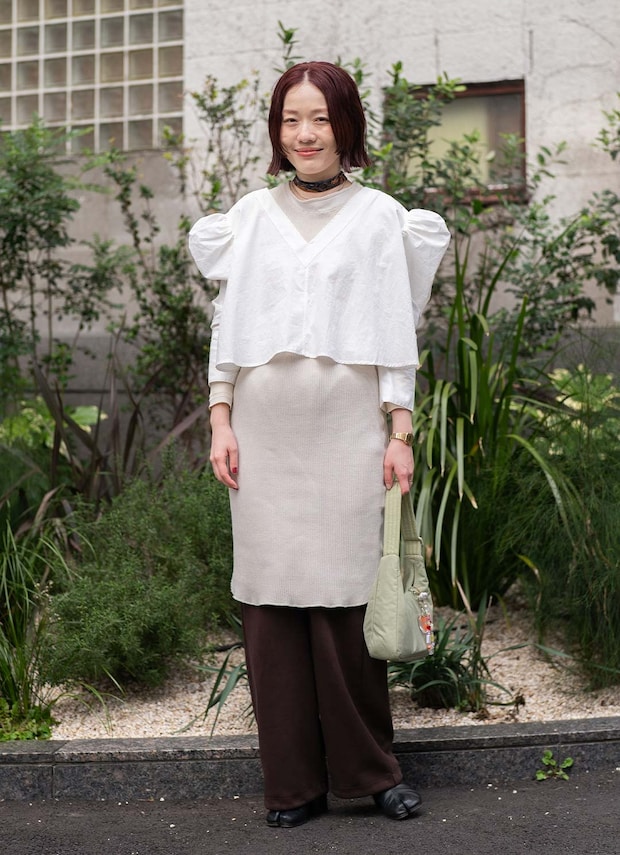 足元はタビシューズでモードに引き締め。きつくならないよう、ボトムスから少し覗かせたバランス感はお見事!