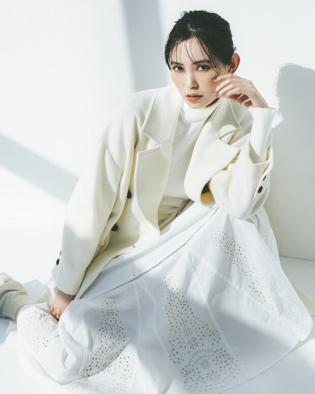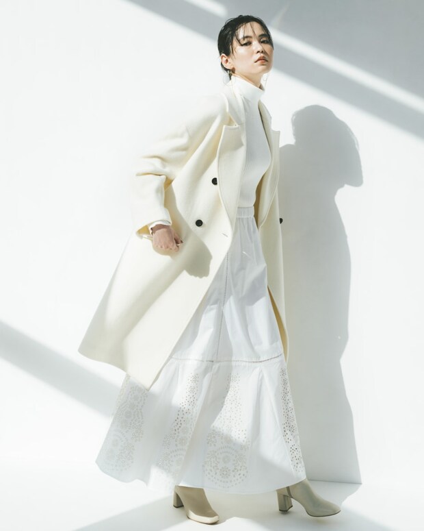 コート¥59,400(カーサフライン/CASA FLINE表参道本店)、ニット¥20,900(RH ヴィンテージ)、スカート¥42,900(ロンハーマン/共にロンハーマン)、靴¥25,850(ダイアナ/ダイアナ 銀座本店)、ピアス¥101,200(GIGI/ホワイトオフィス)