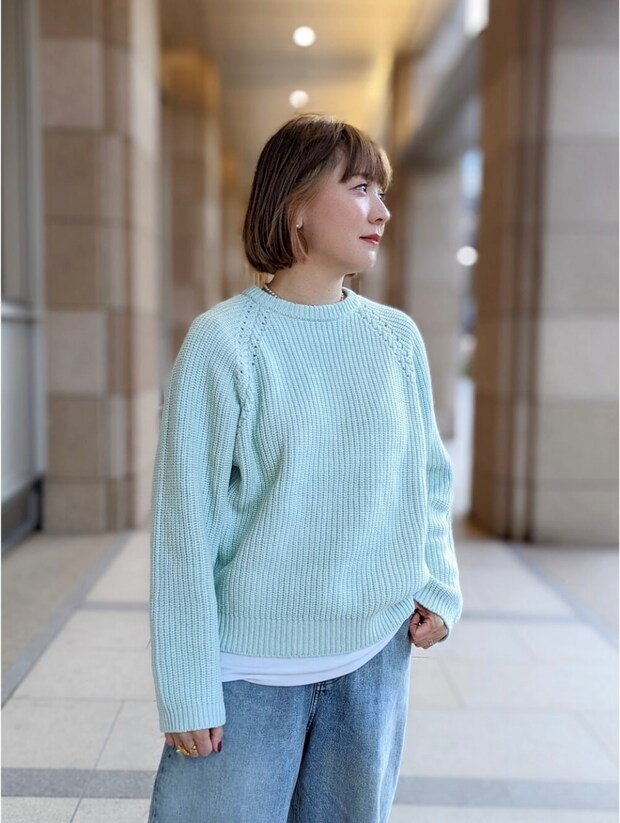 シックになりがちな冬のスタイルに、鮮やかなキレイ色を取り入れて春を先取り! シンプルなニットは合わせるものを選ばず着まわし力抜群。デニムとニットの間に白いカットソーをレイヤードしてヌケ感&こなれ感をプラス。