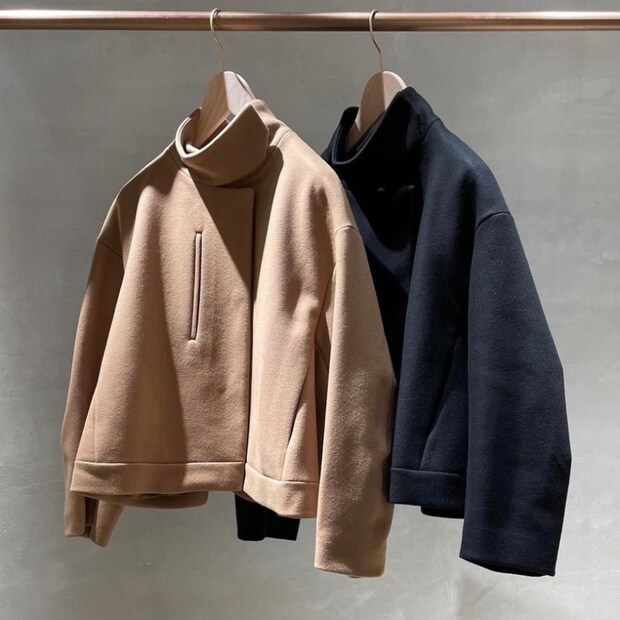 世界三大ウールの産地のひとつである尾州で残反として眠っていた上質な素材を使用。生地も仕立ても上質なコートは長く着続けられそう。梅本さんの着ているブラックとキャメルの2色展開。ショートスタンドコート 各¥42,900(共にアーセンス)