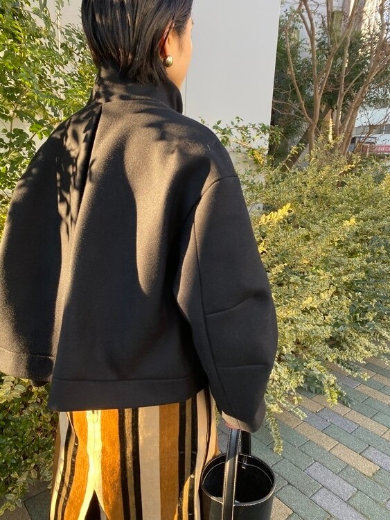 構築的なフォルムとハリのあるウール素材が、着るだけで様になる1枚。アームホールもたっぷりあるので、中にボリュームトップスを着込めるのも嬉しい。背中に入った大きなタックが後ろ姿も美しく見せてくれる。