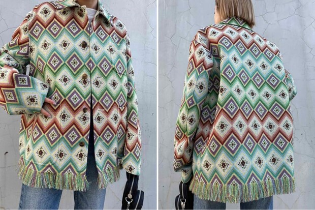 フラワープリント×ジオメトリック柄のブランドオリジナル生地で作られたスペシャルな1着。色使いや裾のフリンジなど、細部にまでこだわりを詰め込んだワークジャケットは、1枚でコーディネートの主役になる存在感と華やかなデザインが◎。ジャケット¥64,900※2月発売予定(アンスクリア)