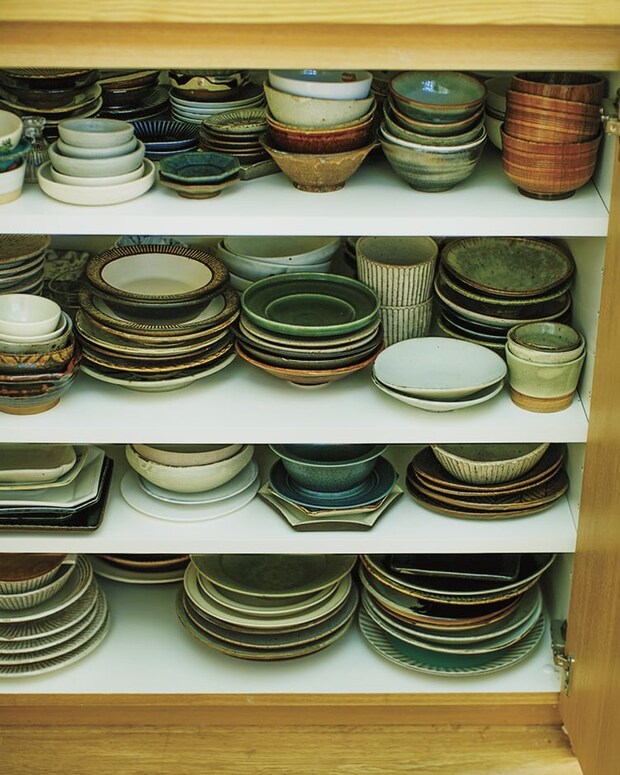 キッチンカウンターの外側に位置する食器棚。器好きの宇藤さんが集めた日本各地の焼き物メインの和食器が、形や大きさ別にぎっしり並ぶ。親子で同じ器を使うのも、モノの大切さを学ばせたいと話す彼女のこだわり。
