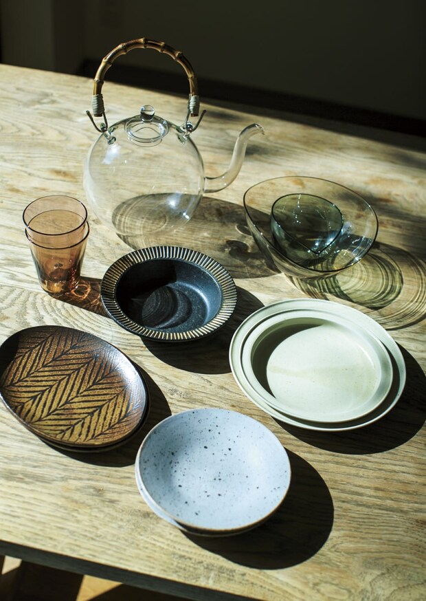 「何かと出番が多いのはこのあたり。和ベースでいてどこか無国籍なデザインが多いですね」(宇藤さん)。右奥から時計回りに:STUDIO PREPAのガラスボウル、伊藤環さんのリムプレート、中里花子さんのウズラプレート、城進さんの鉄絵オーバル皿、高須健太郎さんのリムボウル、STUDIO PREPAのアンバーグラス、YAECAのガラスポット。