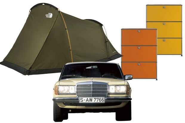 左から:テント¥31,900(ザ・ノース・フェイス/ゴールドウイン カスタマーサービスセンター)、メルセデス・ベンツ 280E※参考商品(メルセデス・ベンツ/メルセデス・コール)、USMハラー3段キャビネット各¥257,292(共にUSM/USM モジュラーファニチャー )