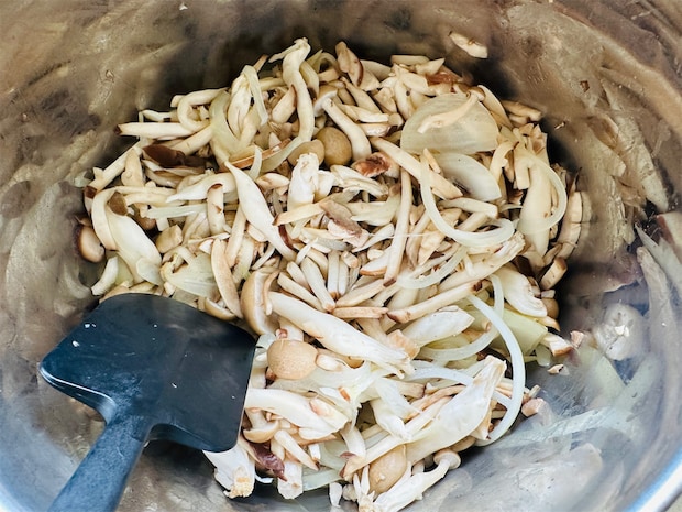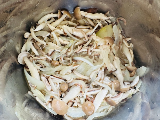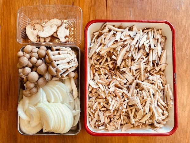 1. しいたけ、マッシュルームは石づきを除いて千切りにします。しめじは石づきを除いて、ほぐします。玉ねぎは薄切りにします。