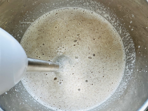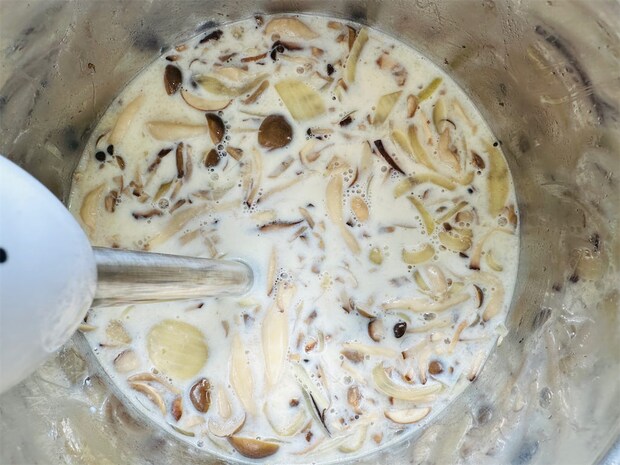 今回は、ハンドブレンダーを使って撹拌します。きのこを撹拌するなんて初めて!どんな感じになるんでしょう〜。
