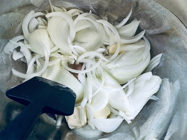 2. 鍋にバターを入れて中火で熱し、玉ねぎを炒めます。しんなりしてきたら、しいたけ、マッシュルーム、しめじを加えて炒めます。