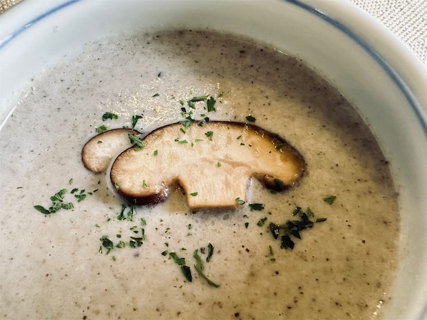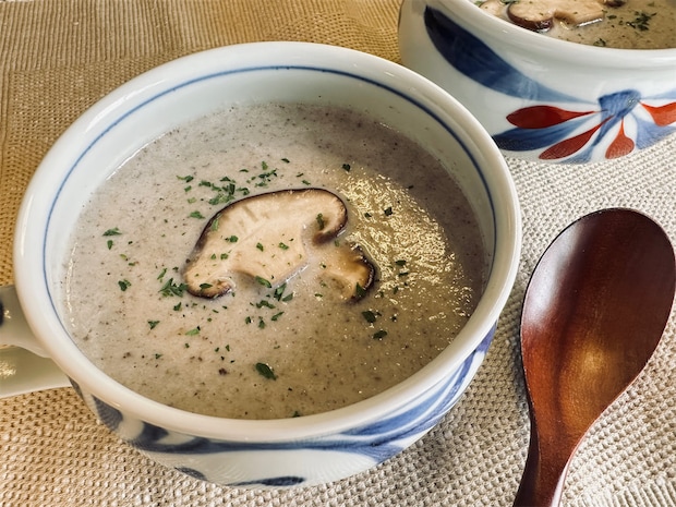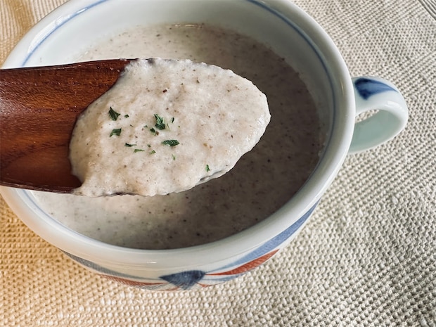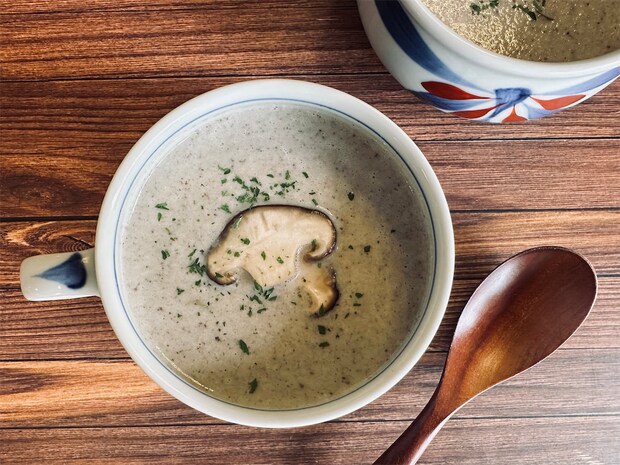驚くほど濃厚な、きのこ三昧のポタージュ。そのままゴクコグといただいてもいいのですが、お肉の主菜などと組み合わせても相性よさそうです。