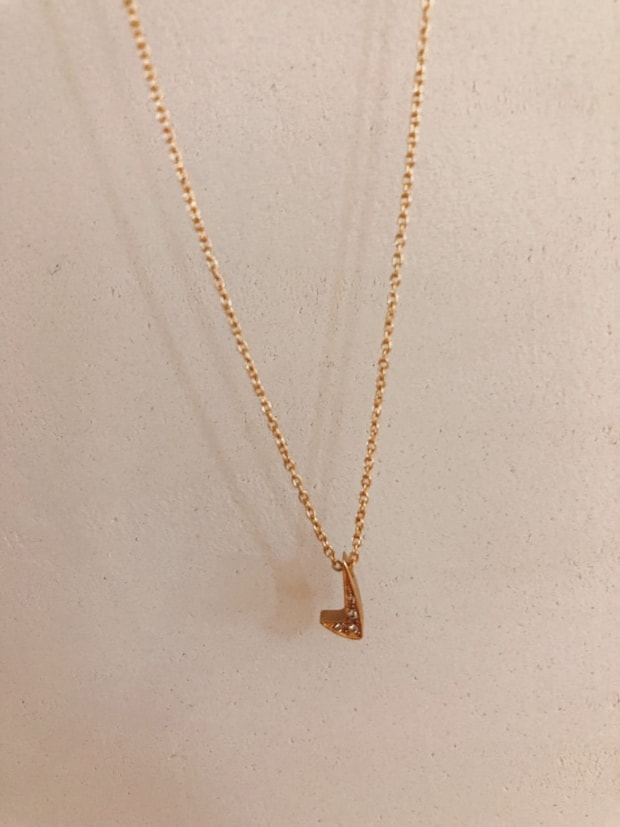 「息子が生まれた記念に何か身につけられるものが欲しいなと思っていたときに、主人がプレゼントしてくれたI'M OKのネックレス。息子のイニシャルですが、フォントのデザインがさり気ないので、いかにもな感じじゃなく普段使いできるところが気に入っています」